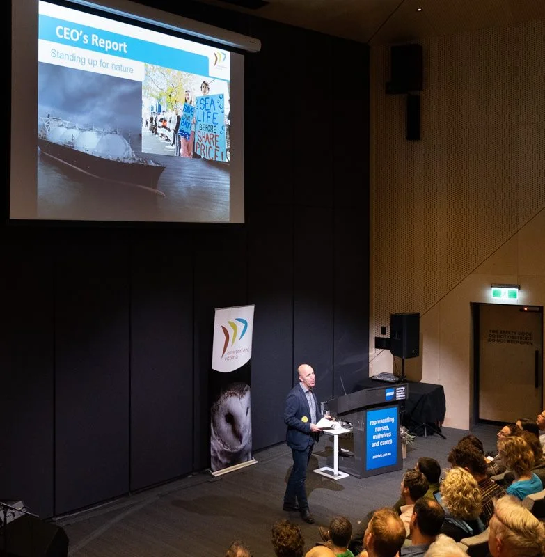 Above: Environment Victoria CEO Mark Wakeham addresses EV members at their annual AGM (Image credit: Candy Van Rood, Save Westernport - No AGL Gas)